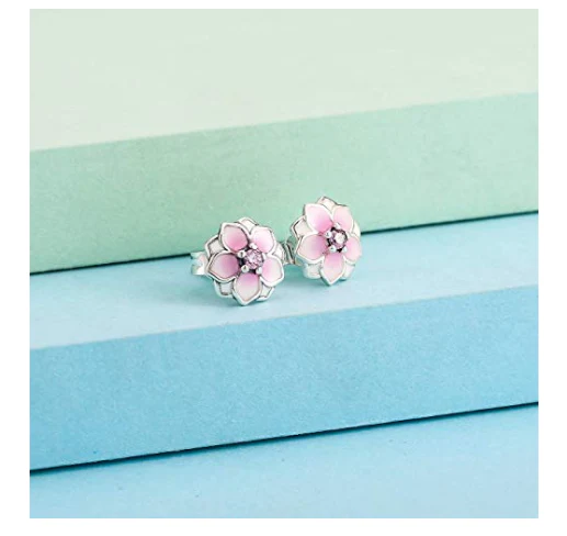 925 silver Pink Magnolia Floral Stud Earrings, Flower—